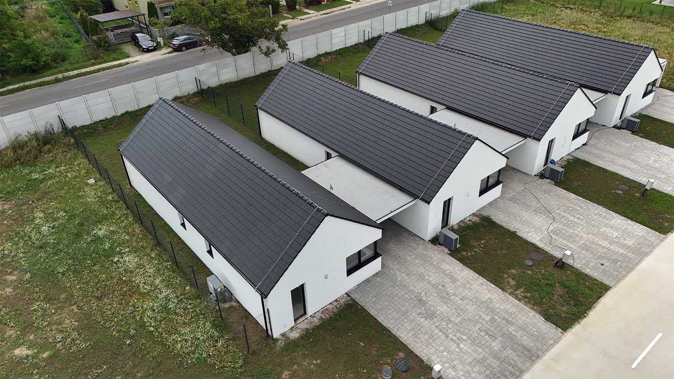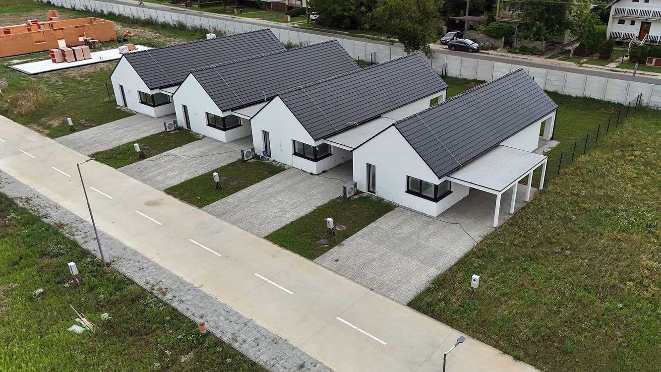 Pre rodiny, ktoré svoje bývanie hľadajú v pokojnej a atraktívnej lokalite máme v ponuke v samostatne stojace domy v radovej zástavbe ( krajný z pravej strany )ktoré sú prepojené prístreškom pre auto.