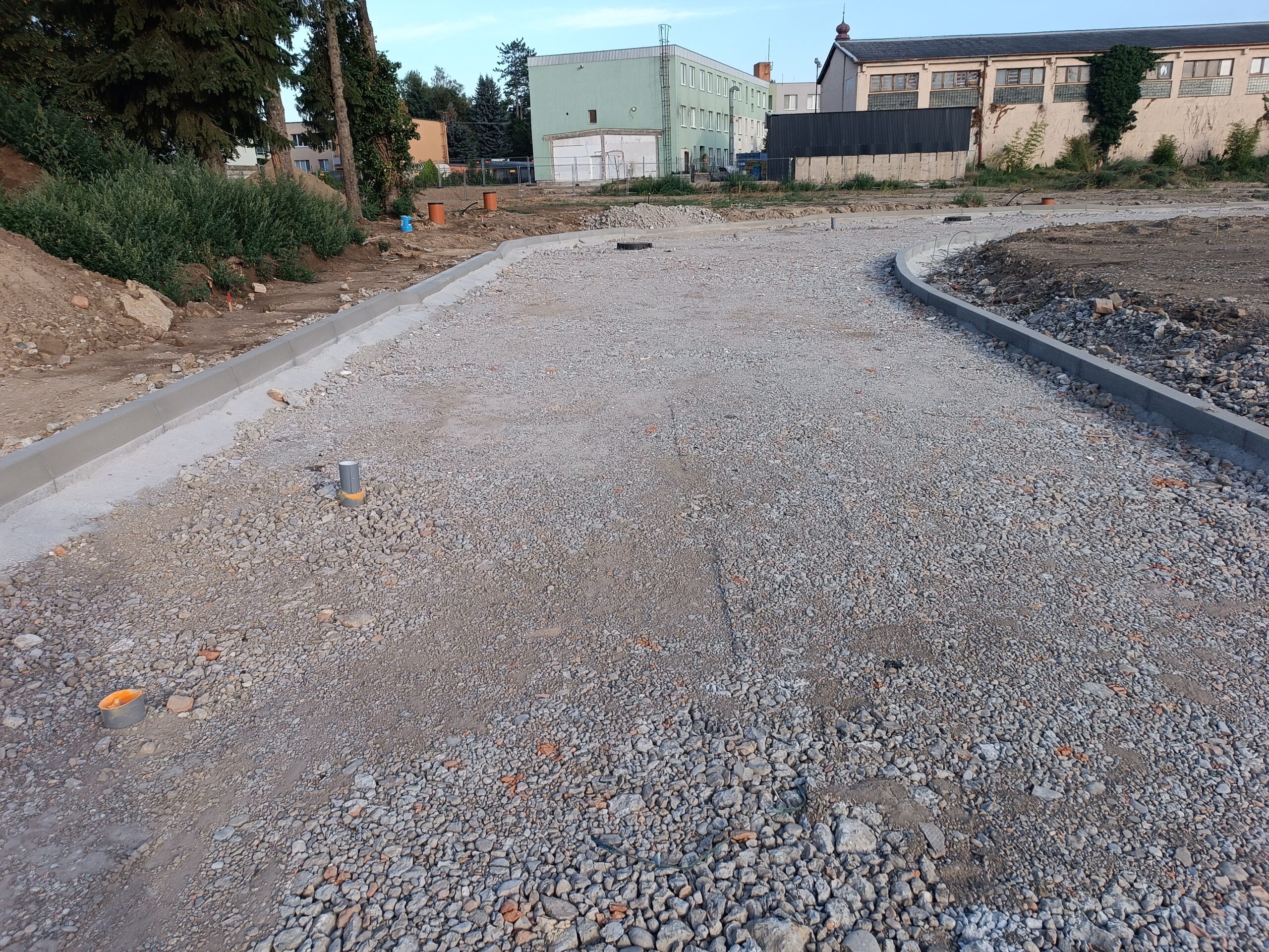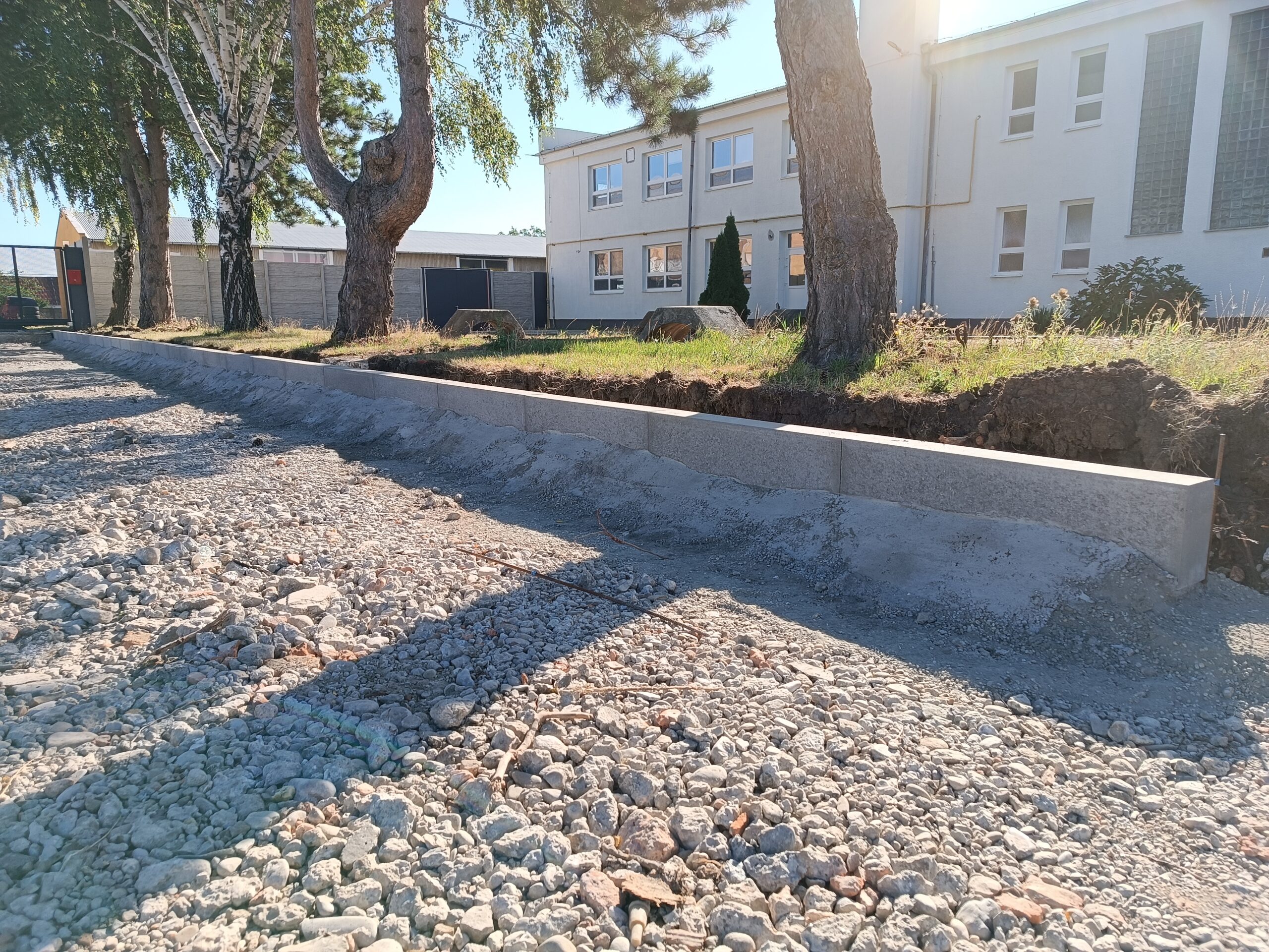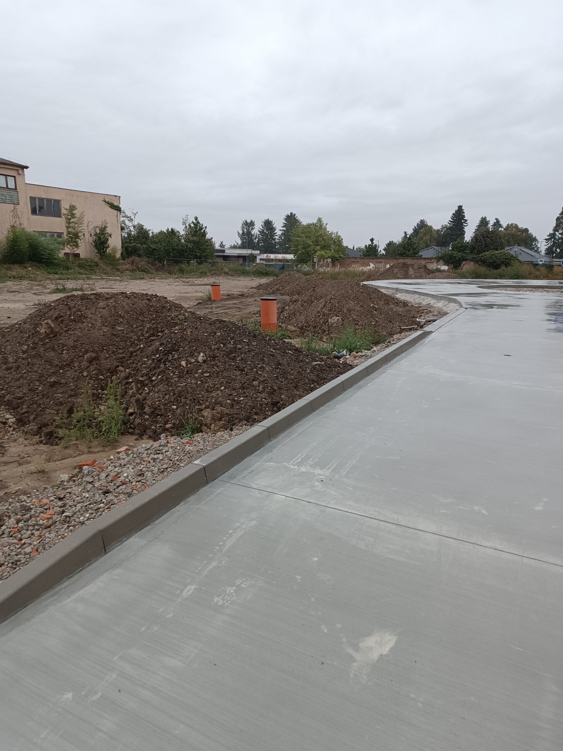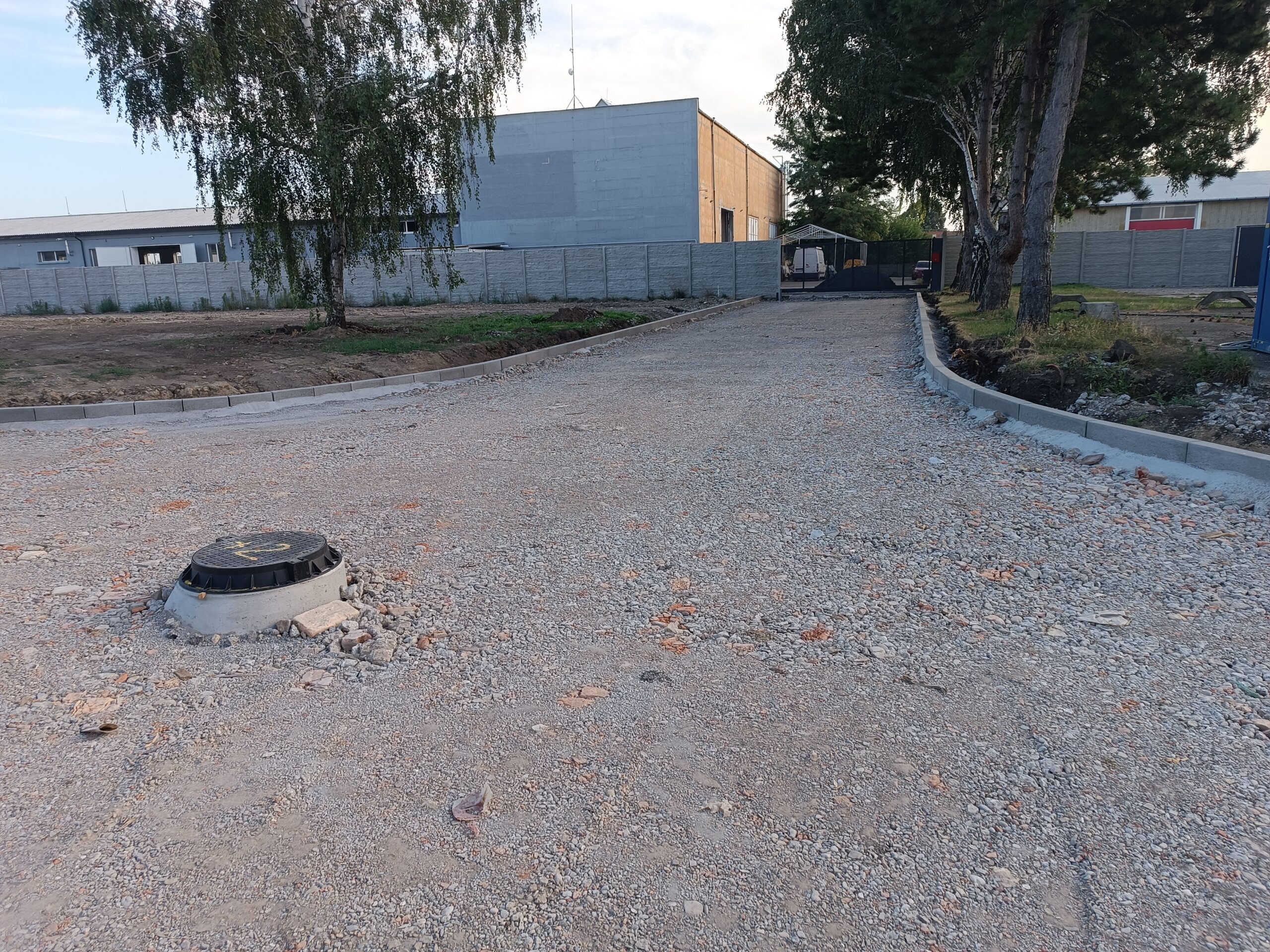 Spevnené plochy a komunikácie, obrubníky, odvodnenie a dopravné značenie.